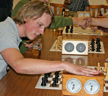 Onze vrees voor versterkingen van hun kant bleek dus ongegrond. Omdat wij pas erg laat zekerheid hadden over onze drie kopmannen kwam dit voor de heren van Kennemer dan ook als een verrassing. Op bord 1 bracht deze surprise nog niet direct iets op. David Howell (op de foto tijdens LCT) kwam zonder voordeel uit de opening en werd beetje bij beetje meer in de problemen gebracht door Robin van Kampen. Uiteindelijk rechtte hij zijn rug en bracht hij een half punt binnen. Op twee had Gawain Jones duidelijk voordeel van zijn voorbereiding. Voordeel op de klok werd voordeel op het bord en de slotcombinatie mag er zijn.