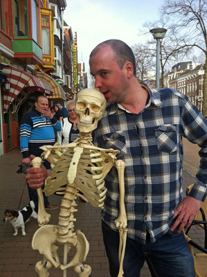 Hagenaar Floris van Asssendelft (linker foto op het terras van Café Atlantis) gaf voordat hij naar het westen terugkeerde nog even wat schaaklessen aan schaakliefhebbers. Misschien heeft hij daarmee weer enige leden geworven. Een van die liefhebbers ging voor het nuttigen van 64 Leffe Blondjes, maar zag het nadat hij halverwege die poging was niet meer zo scherp. Z’n vriendin moest erg lang op ‘m wachten (foto rechts).