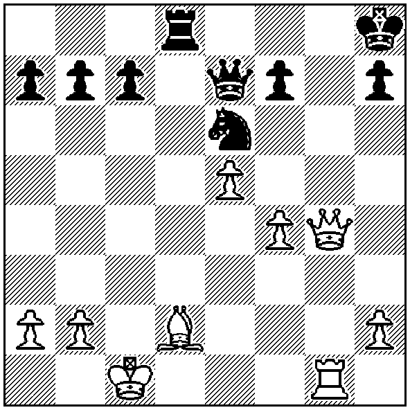 Ziedaar de stelling na 25 f4 van Flear. Dat rijmt! Hij dreigt met f5 mijn paard aan te vallen. Dat paard mag niet weg wegens mat op g7. Wat te doen? Een schaakje met de dame leek me vrij zinloos. Nee, die dame moet dat mat op g7 gaan dekken. En welk een brainwave ontschoot me hier… 25 … f5?? Aaahhhhh!!!! Een schaakje met de dame was helemaal niet zinloos: 25… Dc5+ 26 Kb1 Dd4 27 Lc3 De4+ en Dg6 en zwart gooit de deur dicht. Een nagenoeg gelijkstaand eindspel resteert nog. En eigenlijk helemaal niet moeilijk te vinden als je het zo bekijkt. Maar ik dacht dat f5 zo slecht niet was, maar een zet later ontwaakte ik uit die droom. 26 exf6 ep Stiekem hoopte ik natuurlijk op Dxf5?? Dan had ik met Dc5+ zijn toren gewonnen! Maar nu was ik van plan met de dame die pion terug te pakken en als hij dan Lc3 zou doen kon ik met Pd4 de deur dichtgooien. Dat leek me nog niet kansloos. Echter, nu zag ik pas dat hij na Dxf6 meteen kan winnen met 27 Dxe6!! Daarop deed ik maar 26… Df7 maar het is ineens wel reddeloos verloren. Ik produceerde nog een blunder, maar die had geen invloed meer op het uiteindelijke resultaat: 27 Lc3 Pd4? 28 Lxd4 en opgegeven. 1-0